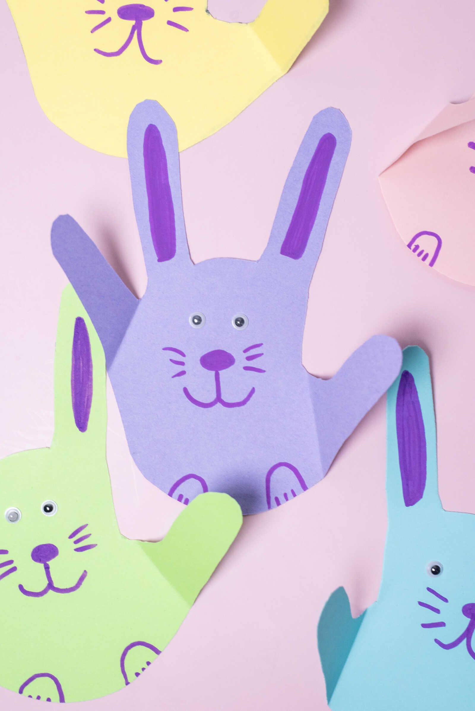 Bunny Handprint Craft finished colorful paper bunnies arranged on a pastel background with cute drawn faces.