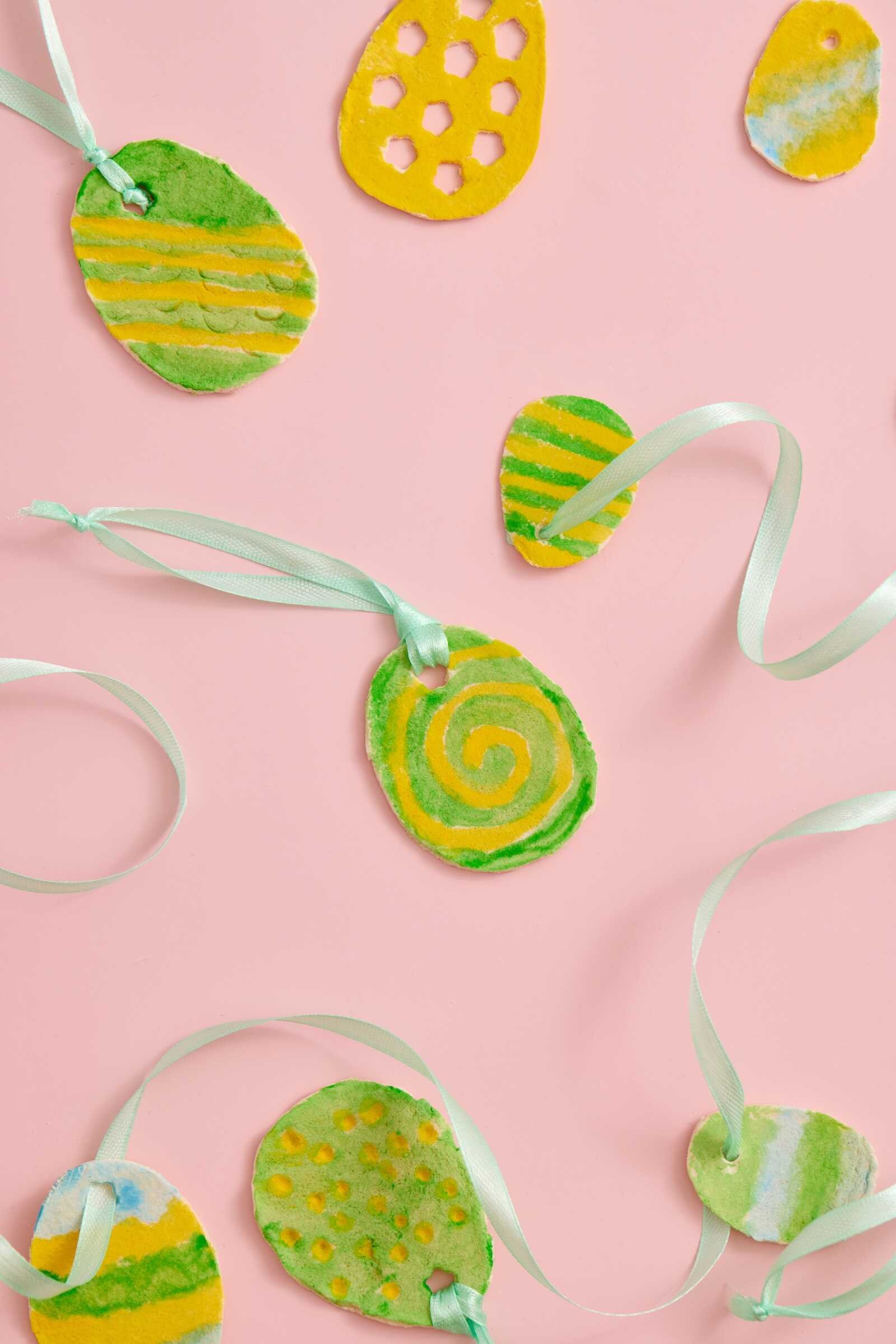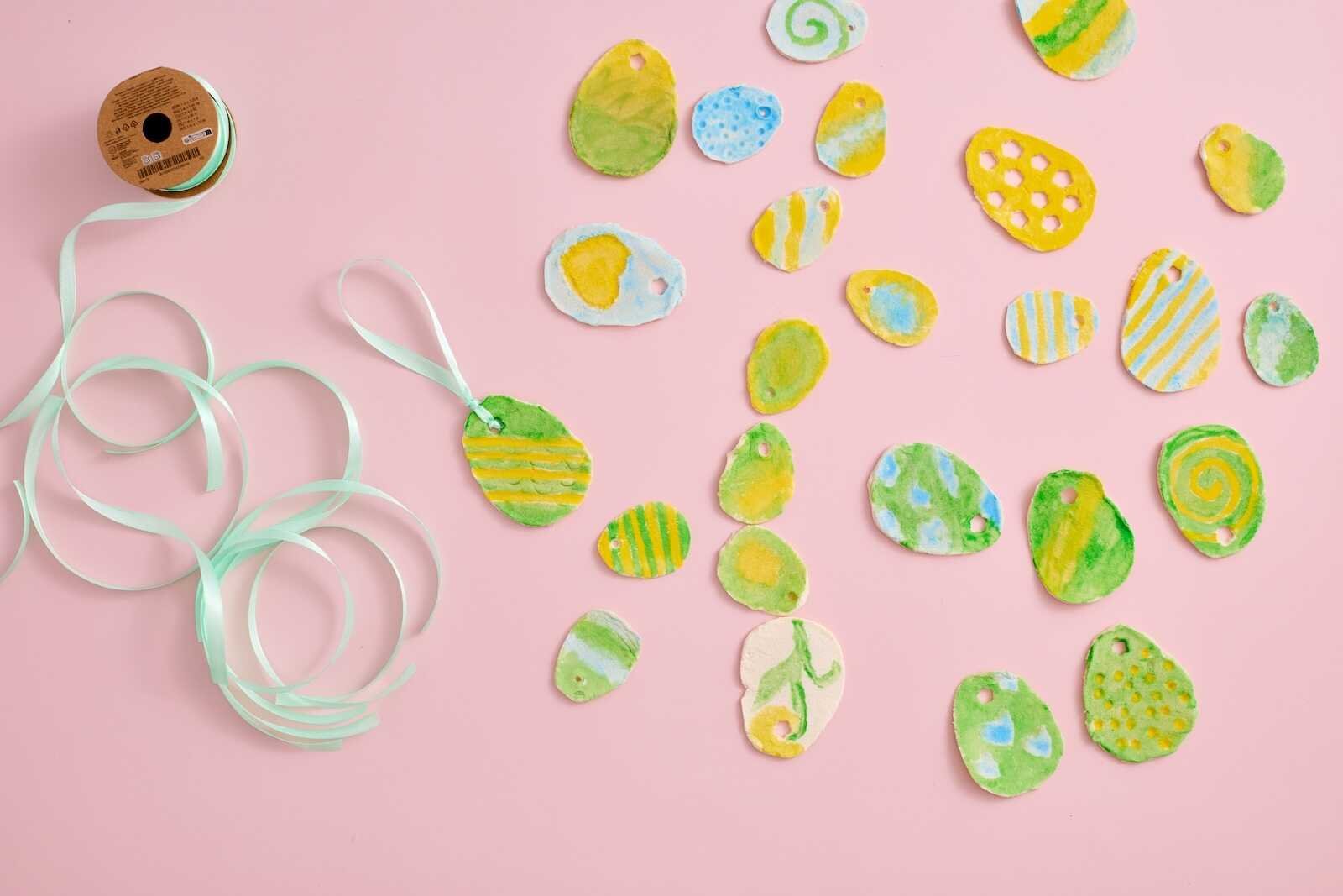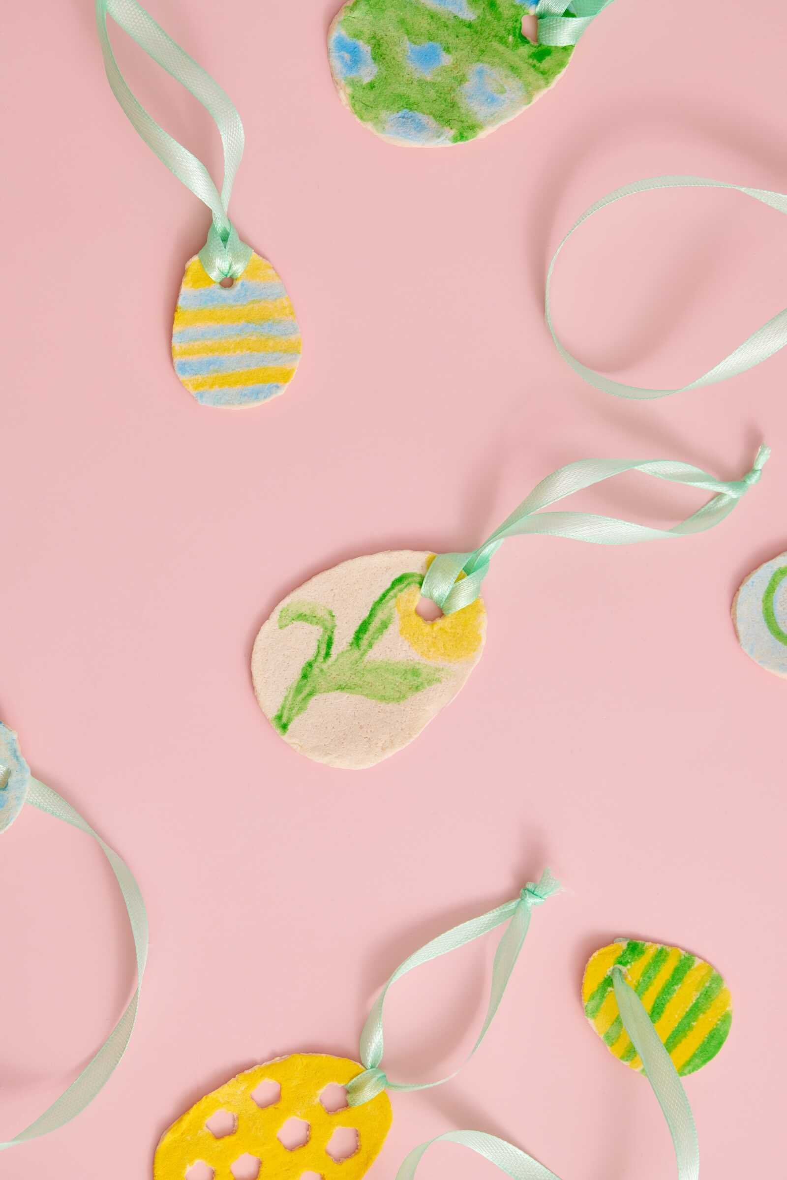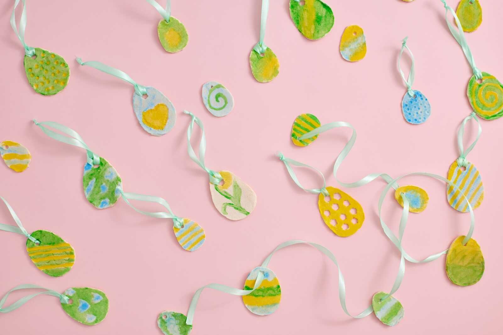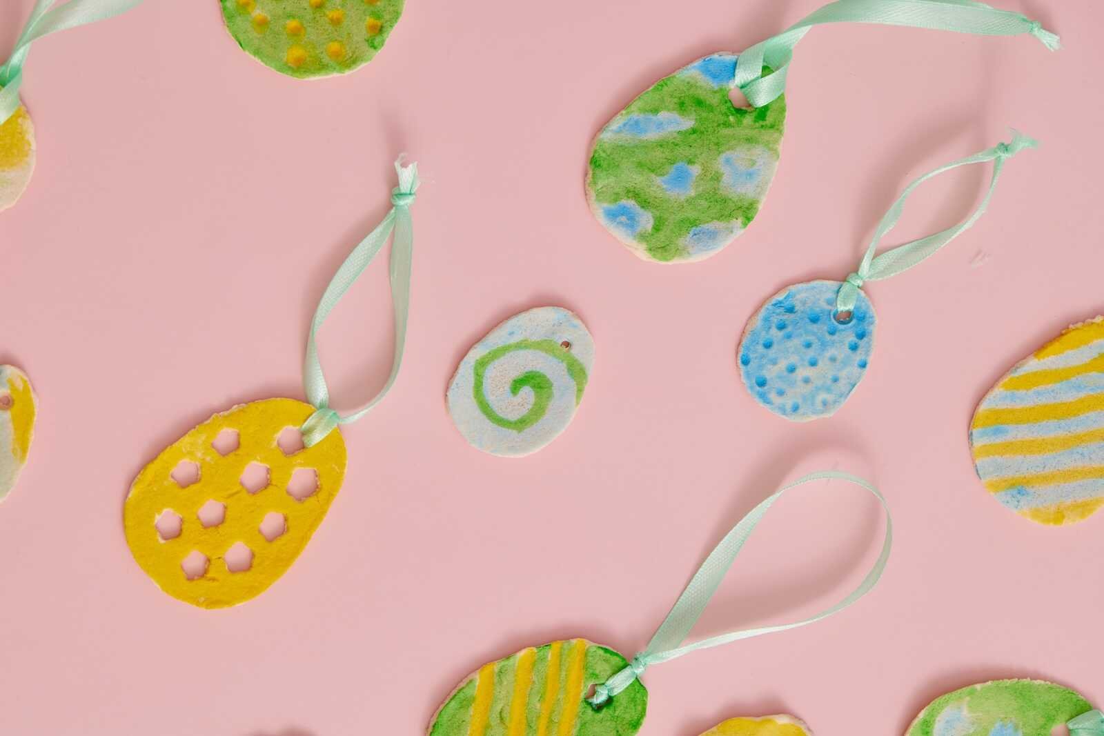 Assorted DIY salt dough Easter eggs painted in pastel colors with ribbon hangers.