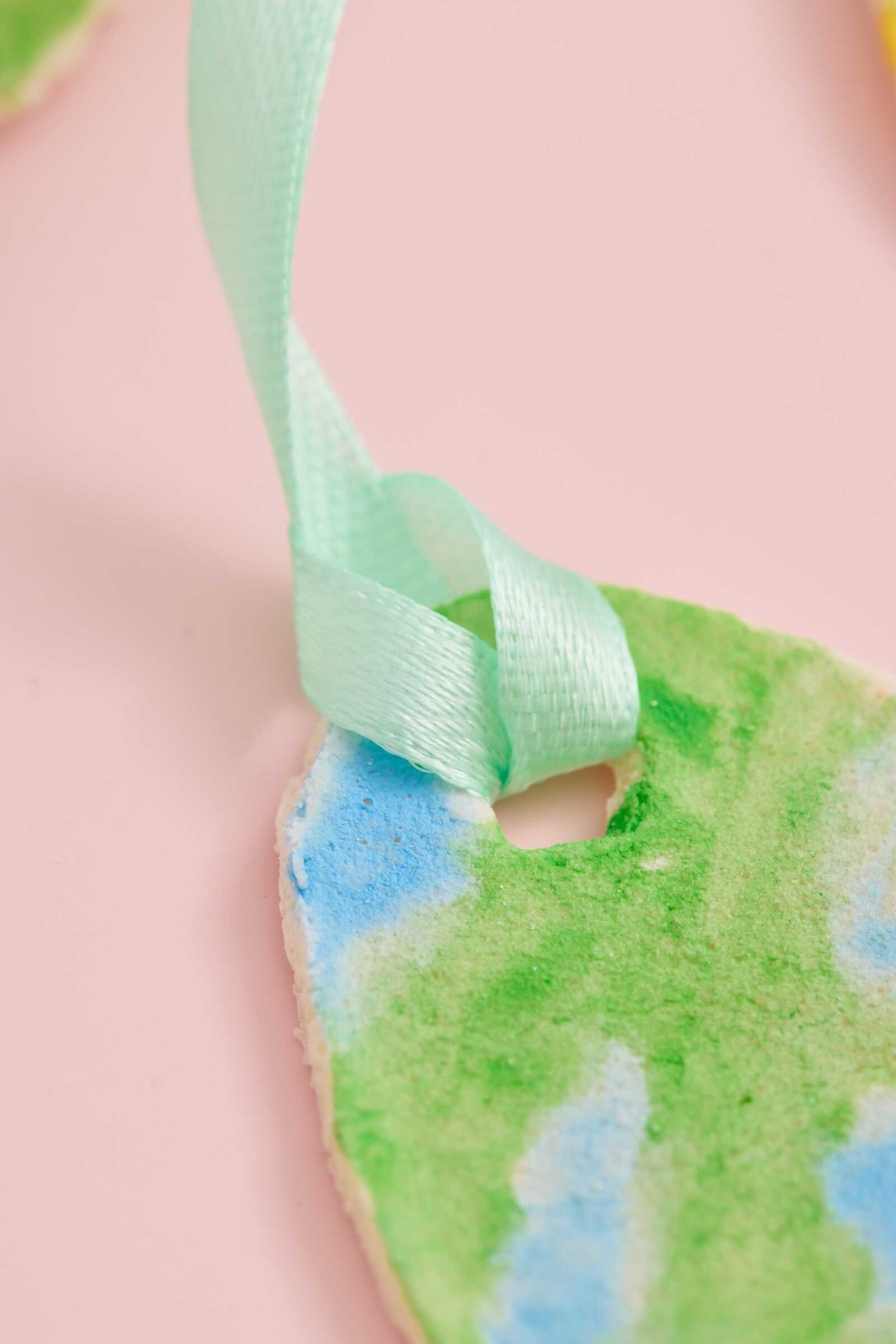 The final step is adding a ribbon so your eggs can be hung as decorations. Cut a small piece of ribbon and thread it through the hole at the top of the egg. Tie the ends into a knot or small bow. Now your salt dough Easter egg is ready to hang beautifully.