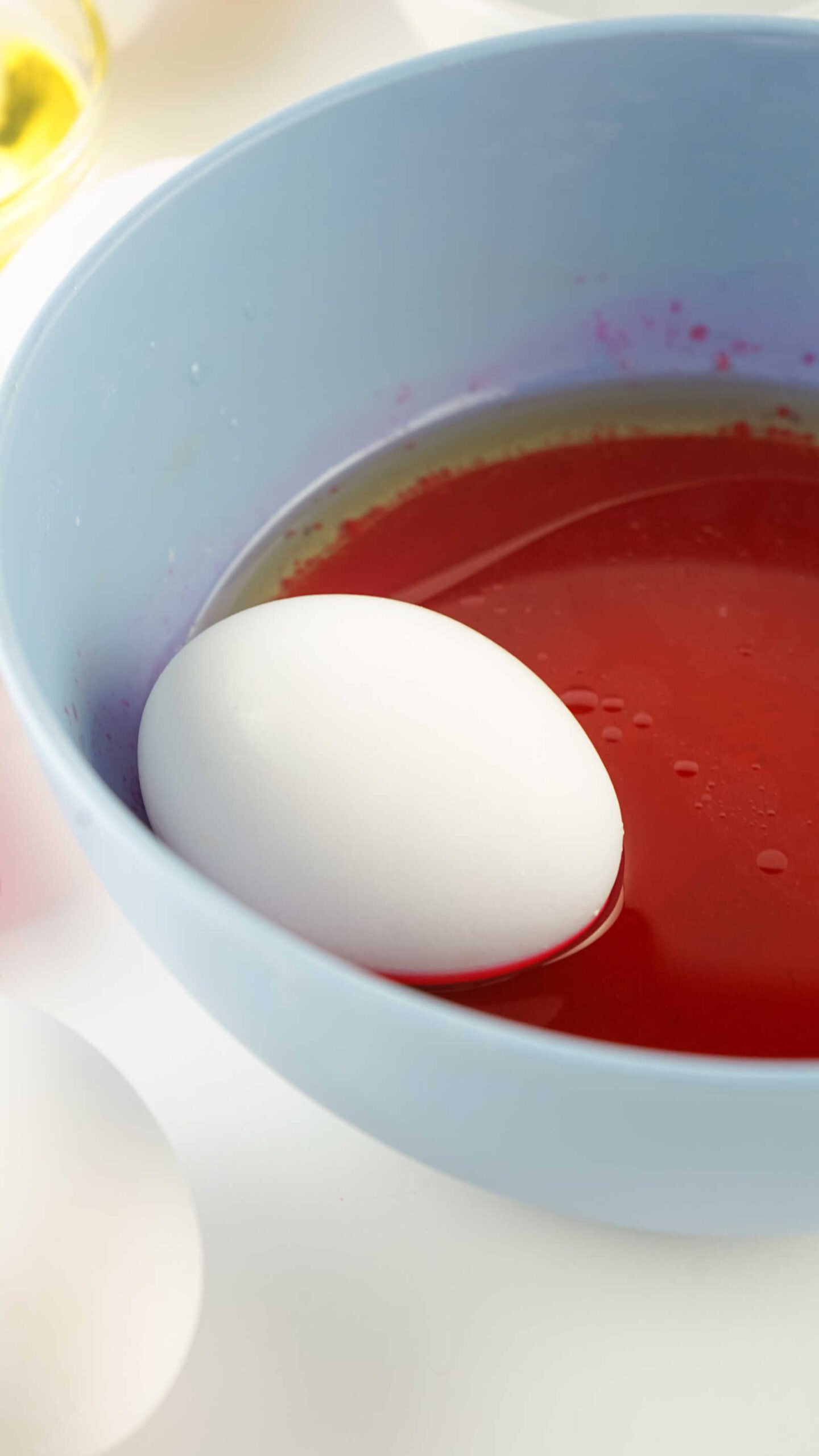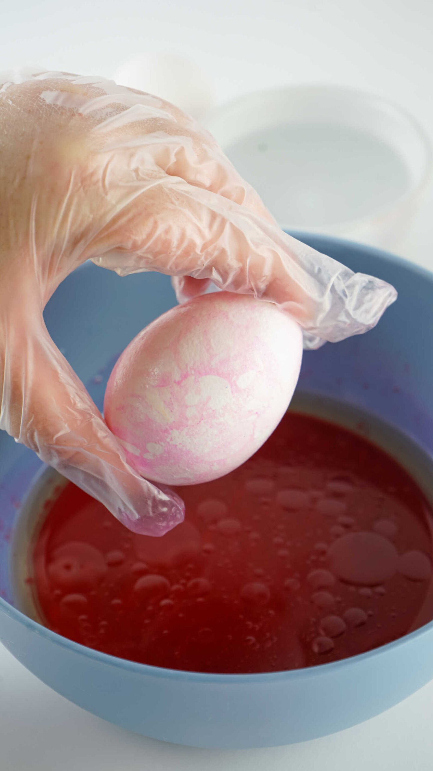 Immediately place the egg into the bowl and quickly roll it around, making sure all sides touch the dye at least once.