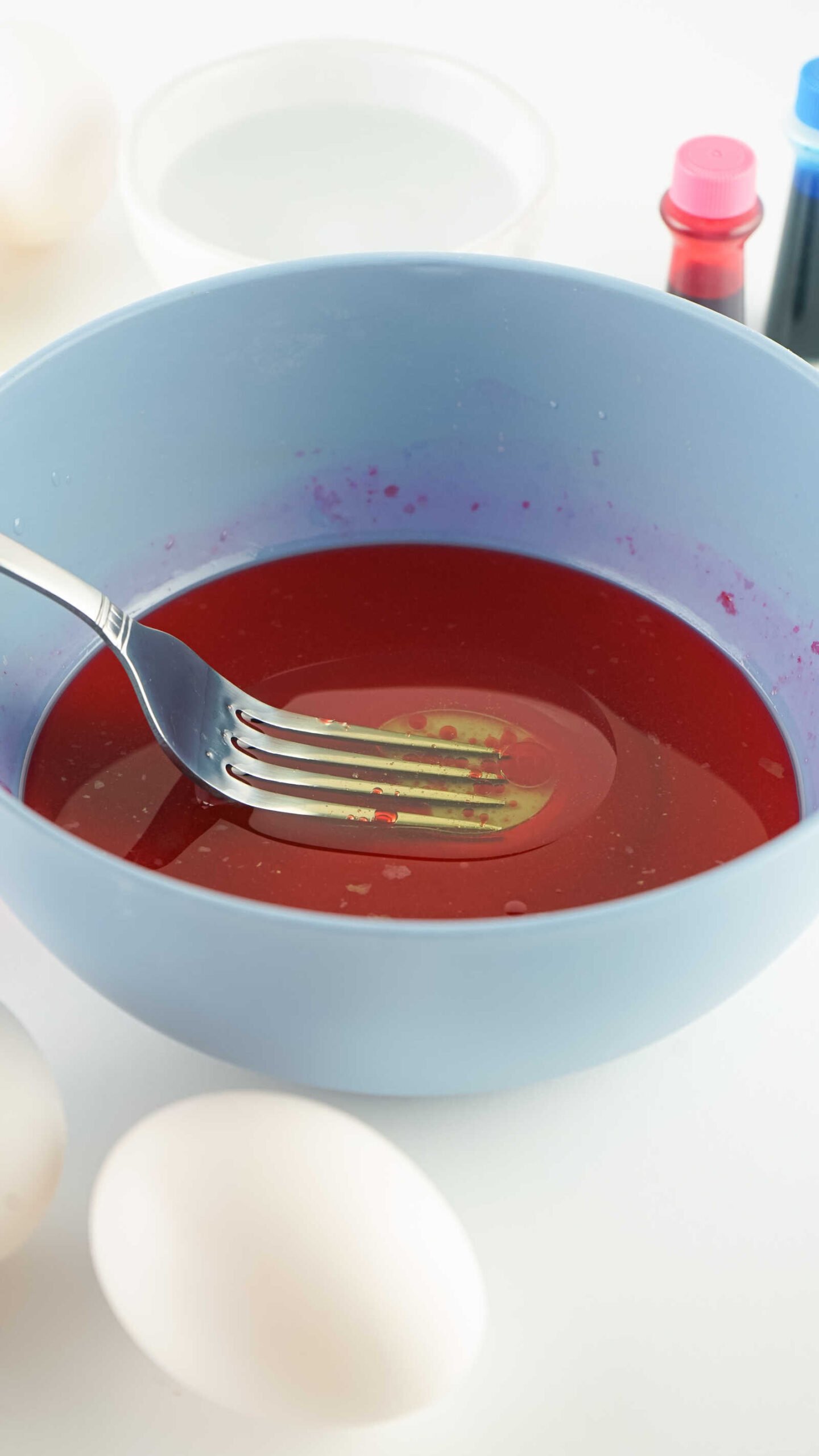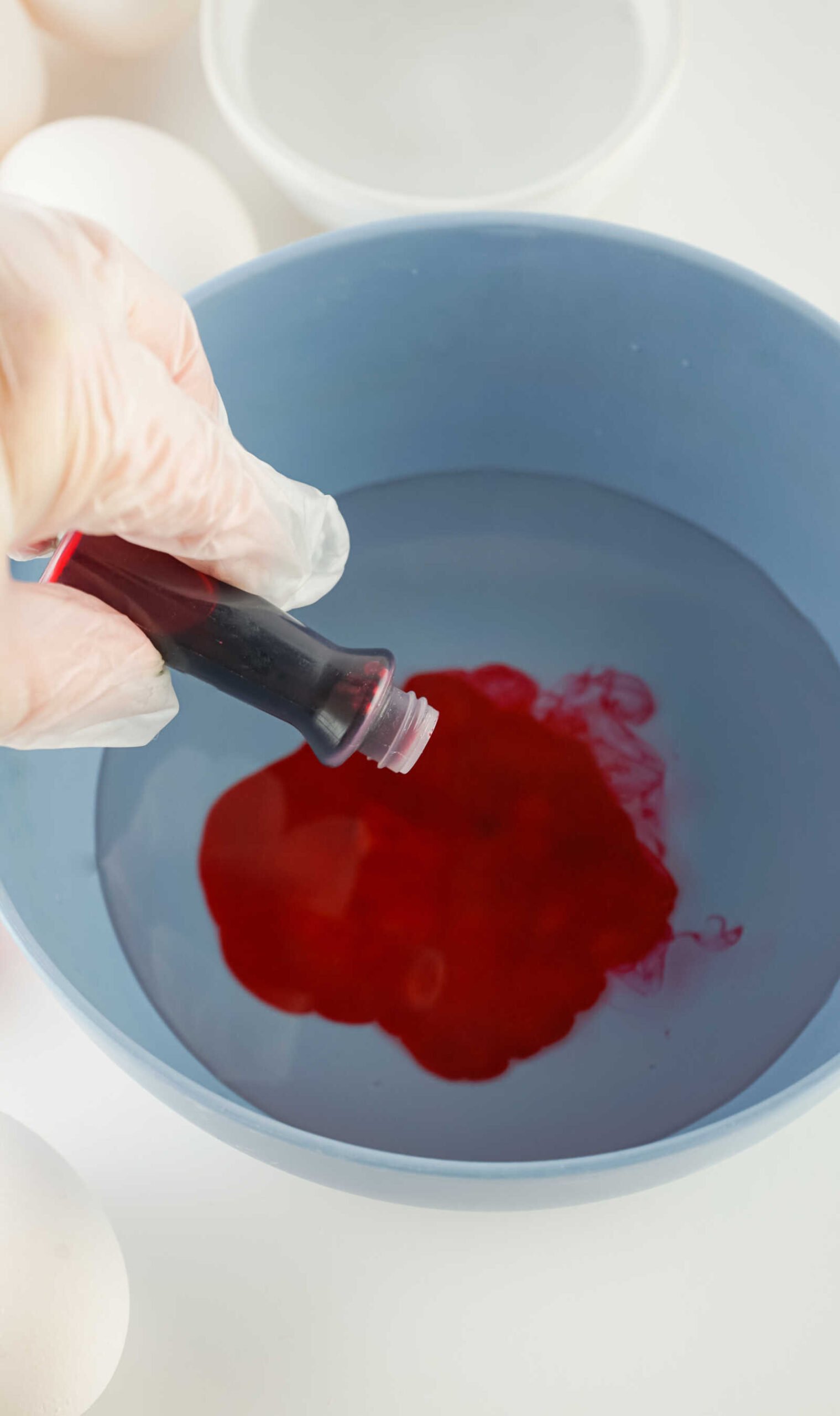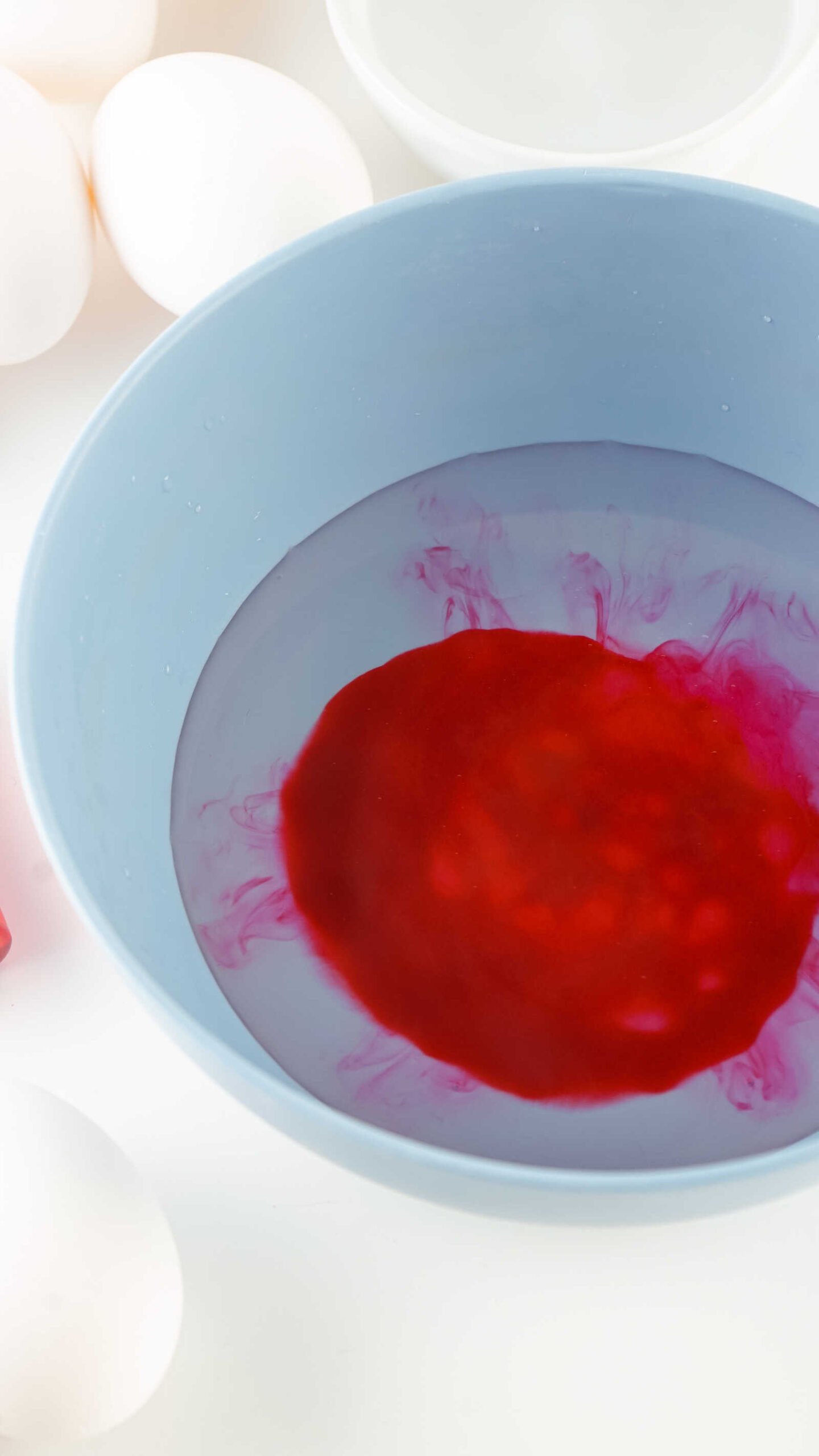 Pour ½ cup of boiling water into each bowl. Then add ½ tablespoon of vinegar to help the dye stick to the eggs.