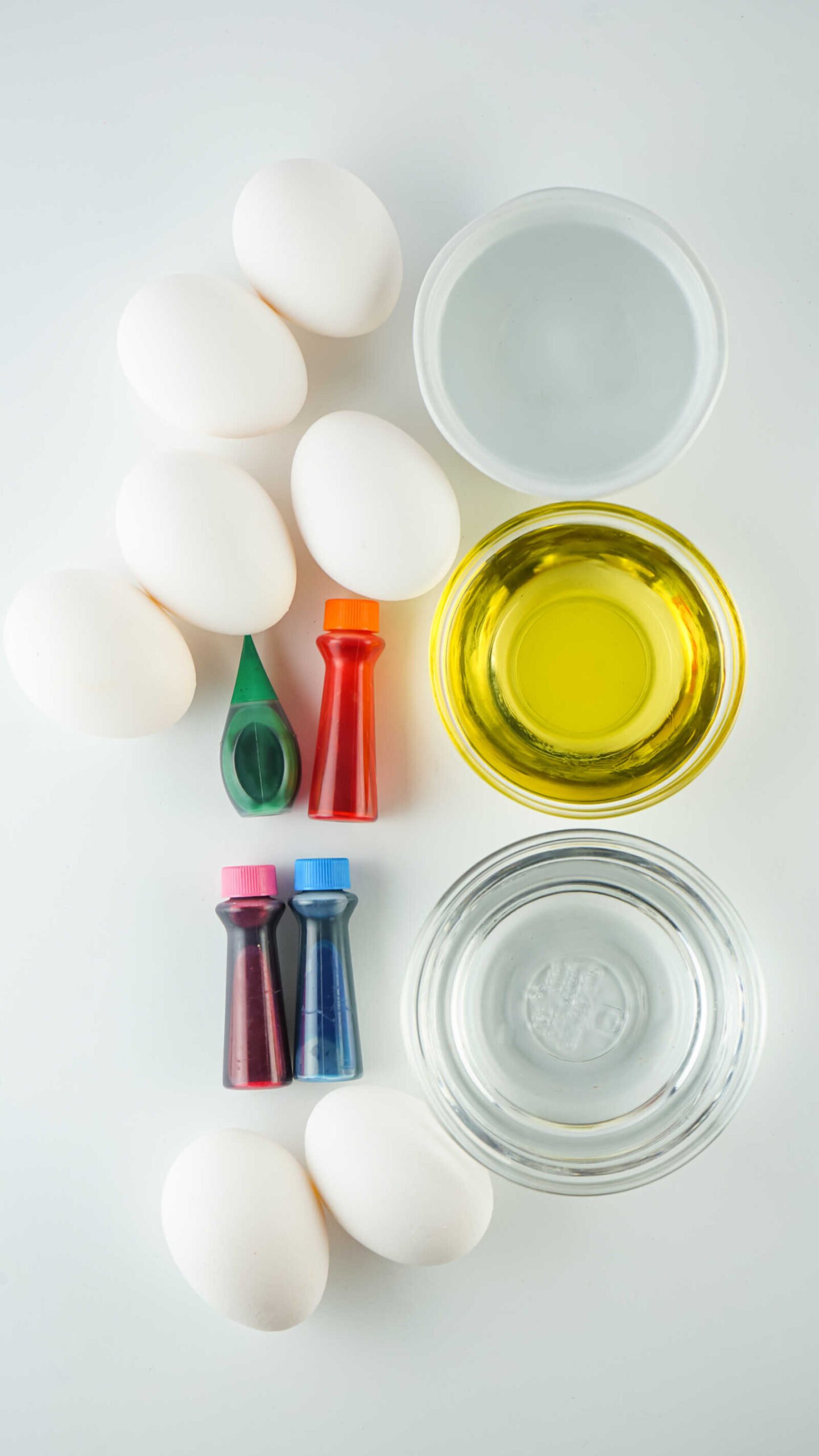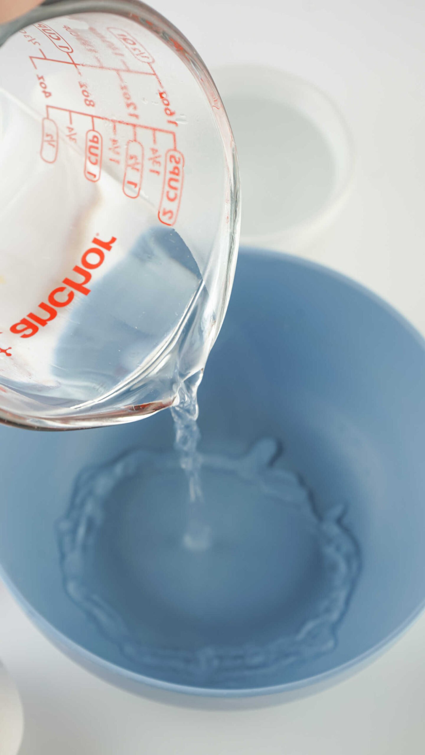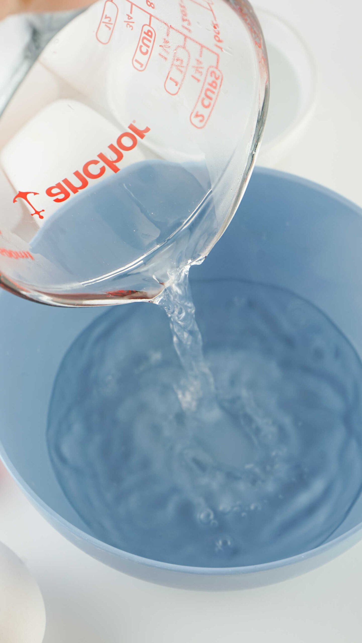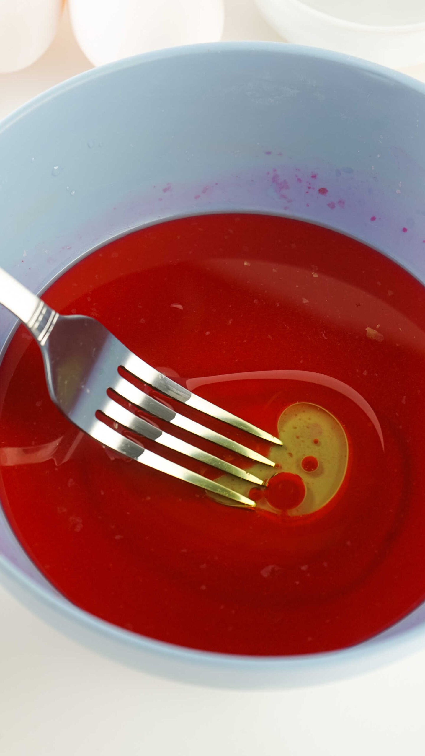 Pour ½ cup of boiling water into each bowl. Then add ½ tablespoon of vinegar to help the dye stick to the eggs.
