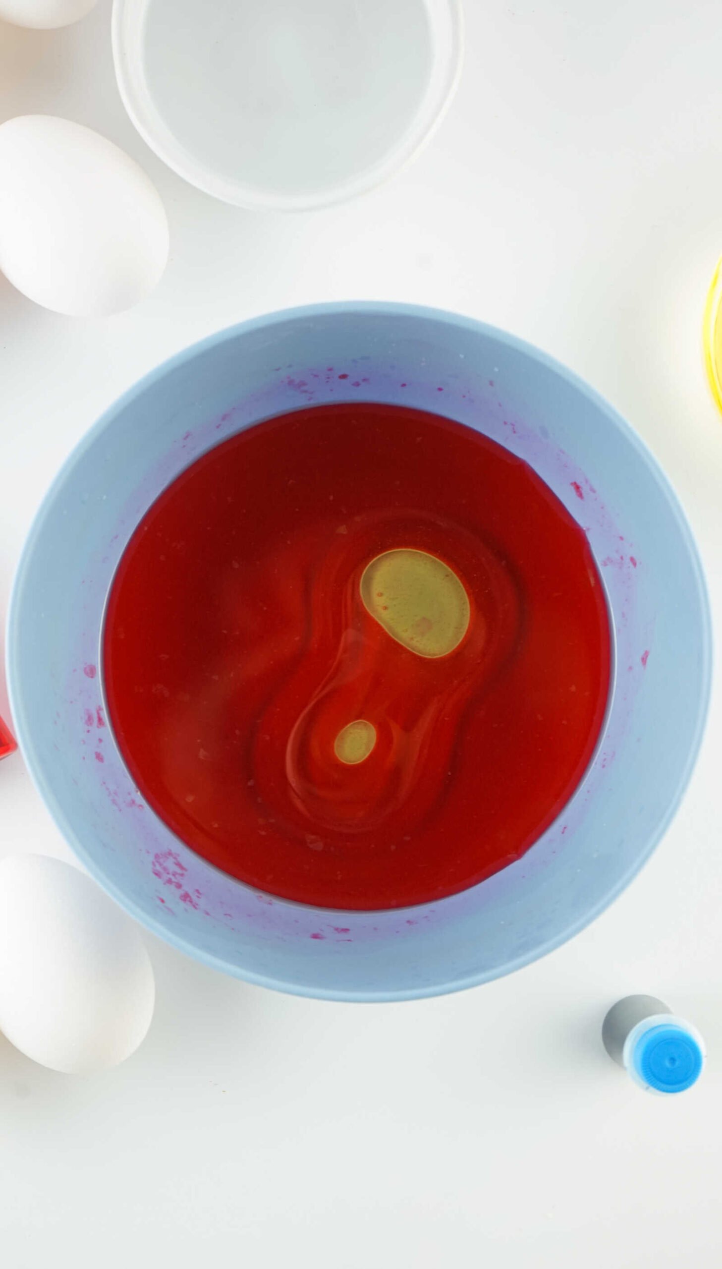 Oil and water don’t mix—so when you add oil to your dye bath, it creates tiny pockets that resist the dye. When your egg rolls through the mixture, those oil spots prevent the color from sticking evenly, leaving behind those dreamy swirls and streaks.